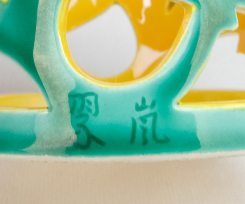 交趾焼の人気作家、中村翠嵐作で交趾銀杏蓋置です。緑と黄色のコントラストが印象的な良い細工の蓋置です。銀杏が緑色の季節から黄色に色づく季節まで幅広くお使いいただけます。