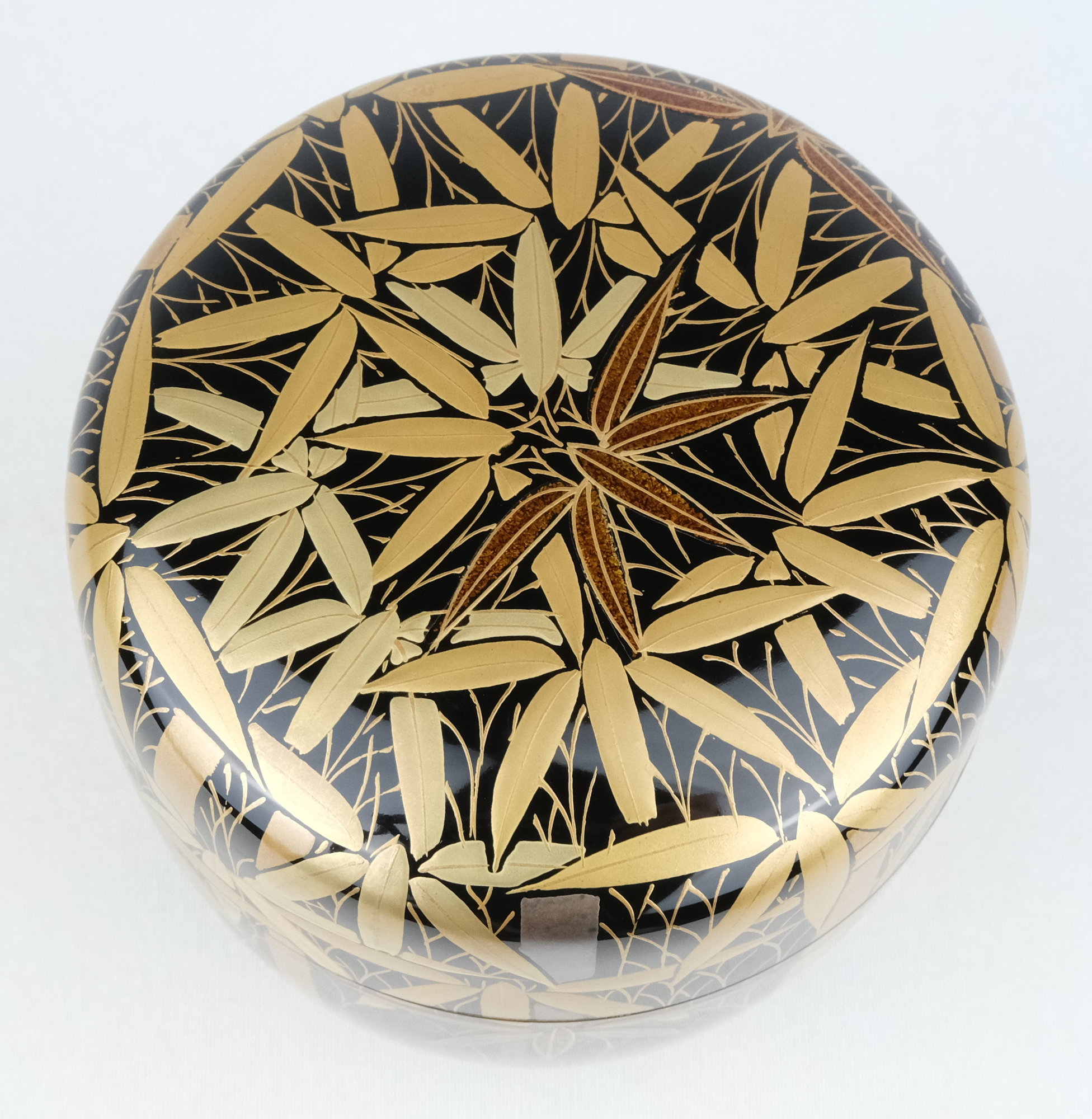 山中塗の作家、多田桂寛作で総竹林大棗です。全面に竹の蒔絵が施された季節を問わずに使いやすい大棗です。一本だけ銀で蒔絵がしてある竹を目印に上下を合わせると使いやすいでしょう。