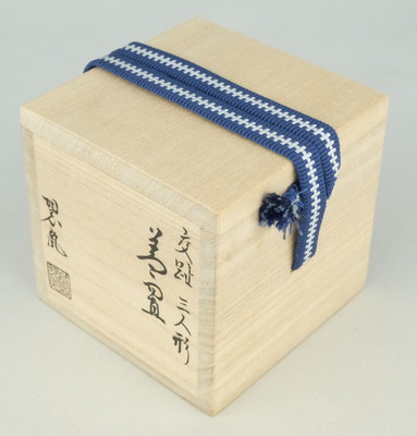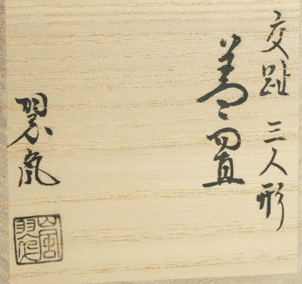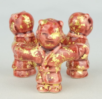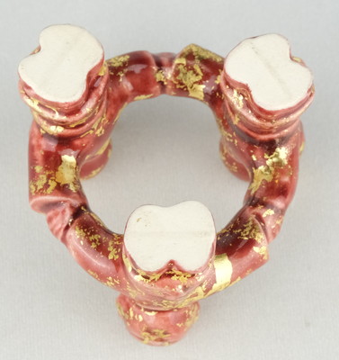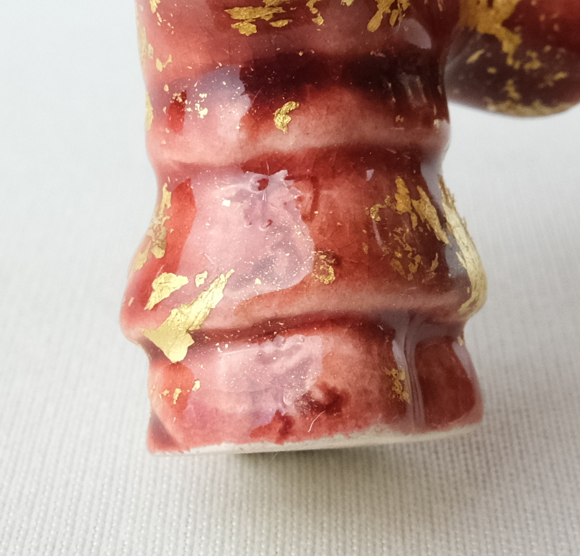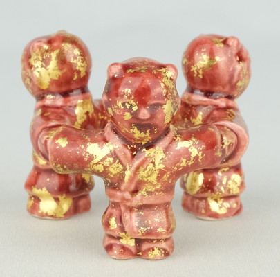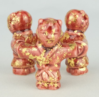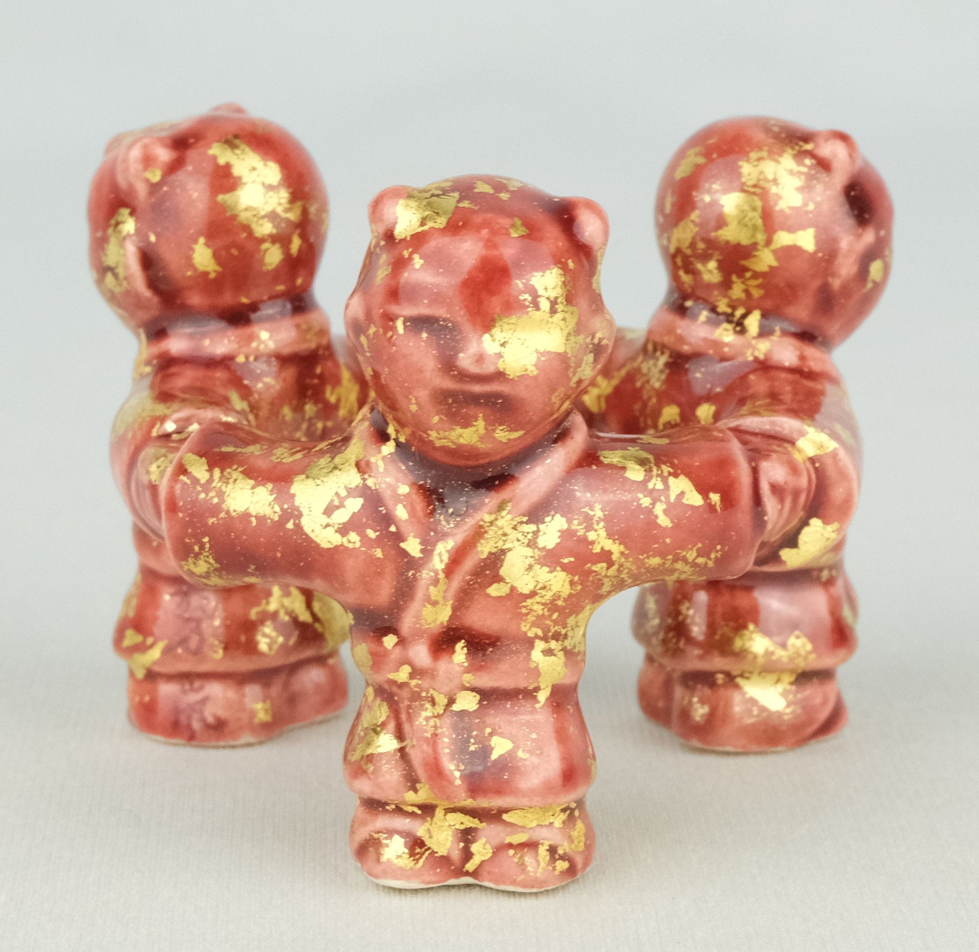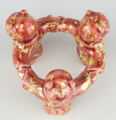 交趾焼の人気作家中村翠嵐作で交趾三人形蓋置です。赤色の交趾釉に金が散らしてある華やかな手の蓋置です。