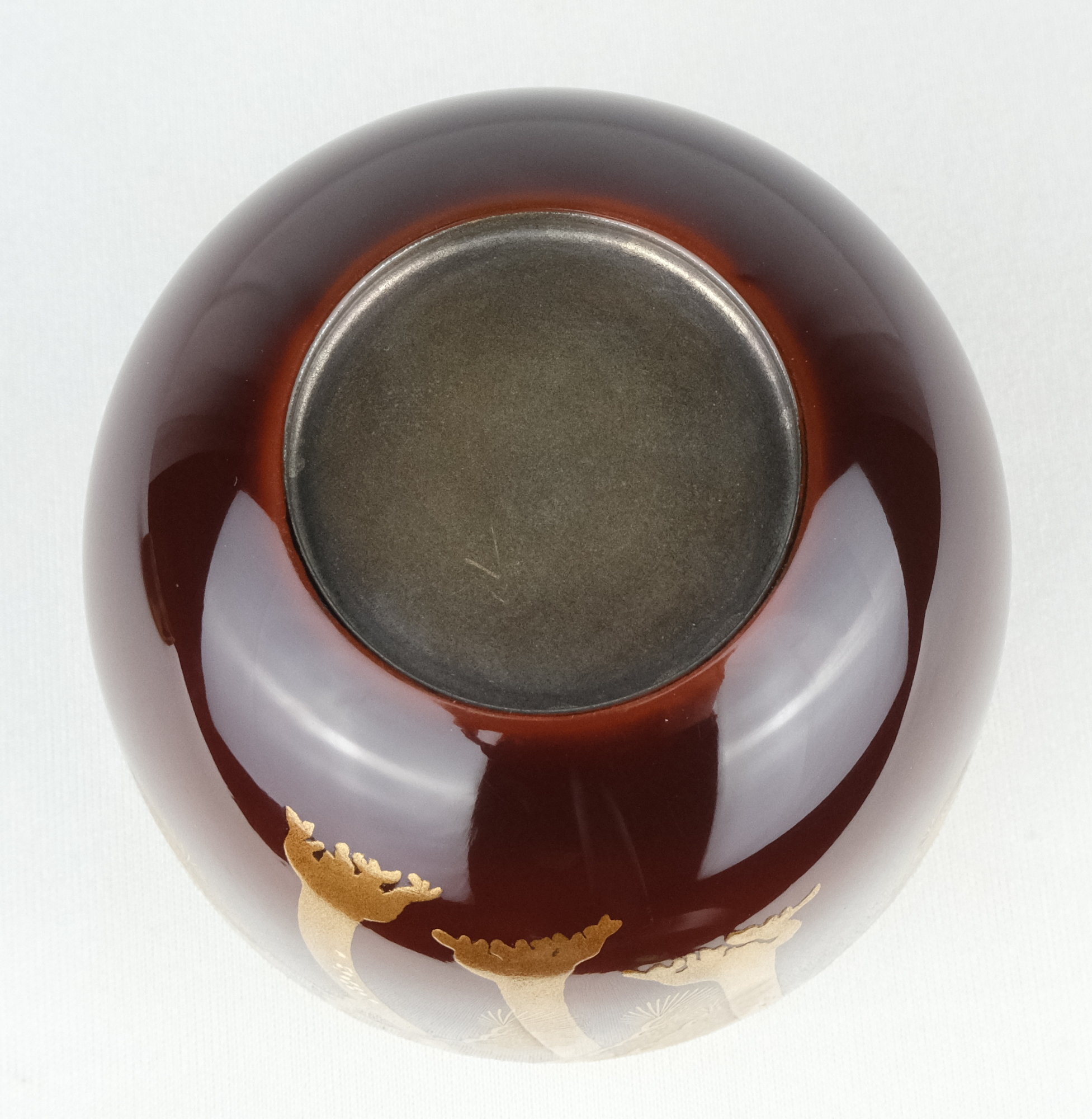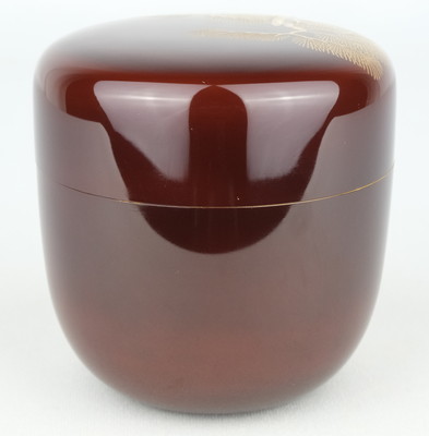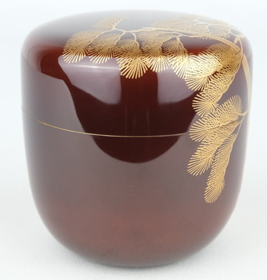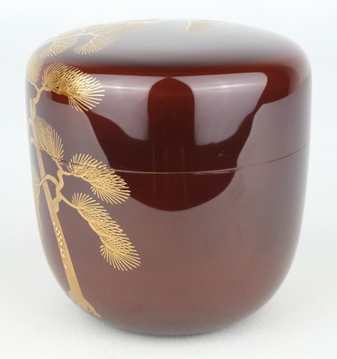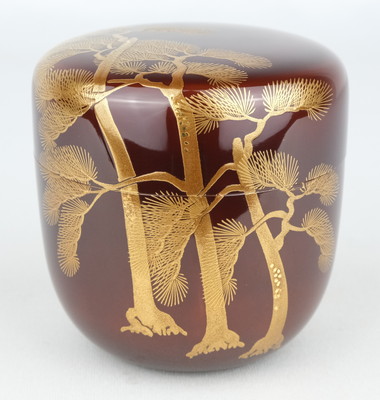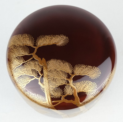 赤みがかった色合いが印象的な溜三本松蒔絵内銀地大棗です。作は祥雲です。味のある溜塗に季節を問わない三本松の蒔絵で使い勝手の良い大棗です。中も銀地で良い手のお棗です。
