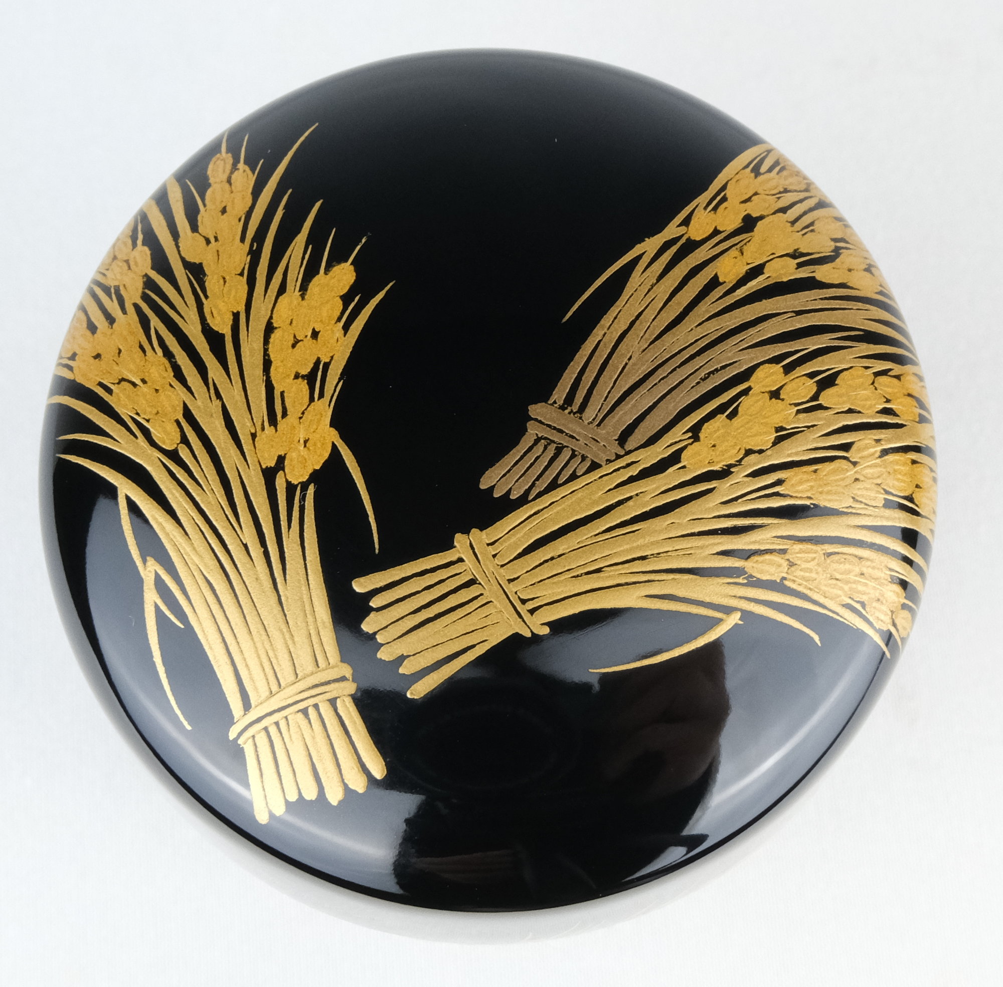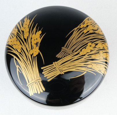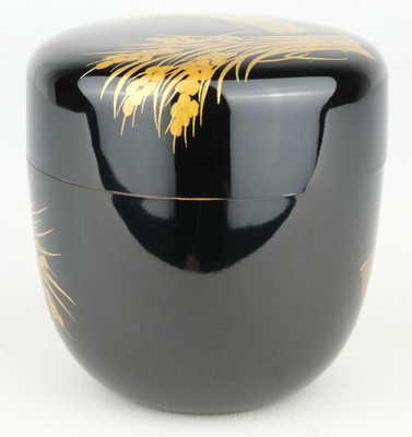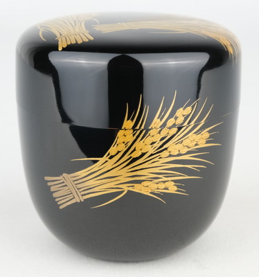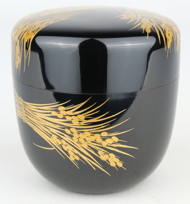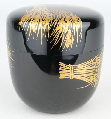 輪島塗の人気作家、一后一兆作で稲穂棗です。実りの秋にふさわしい稲穂の中棗です。内も金地で華やかな手の中棗です。