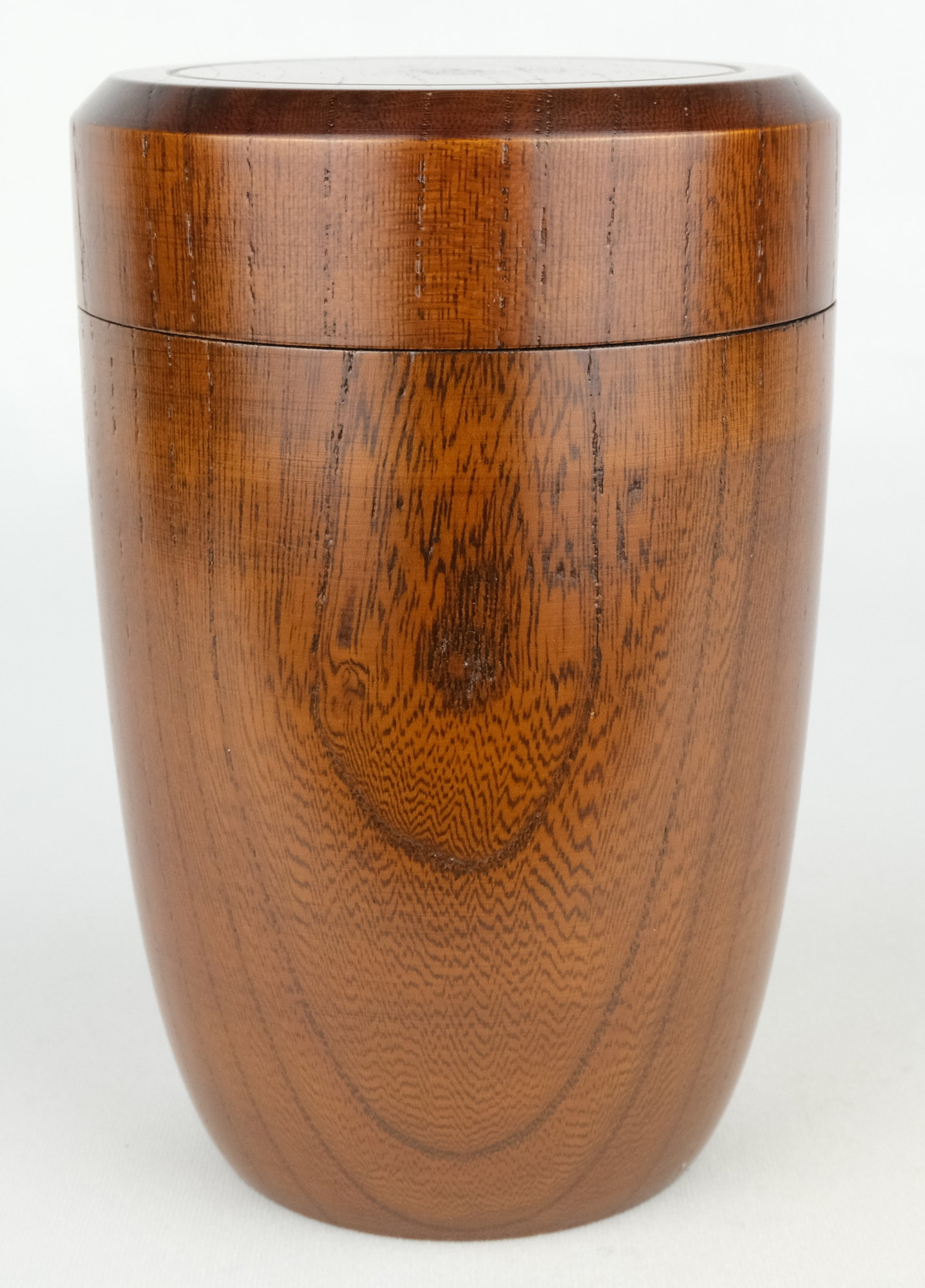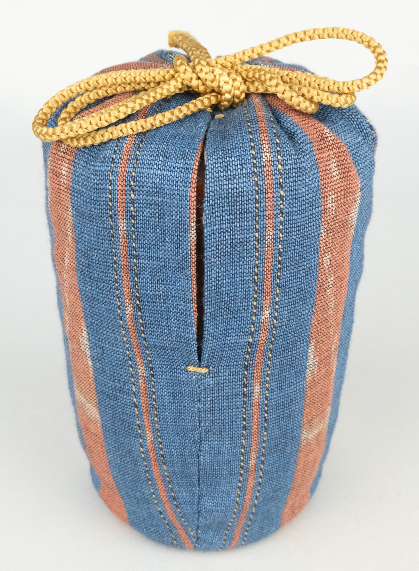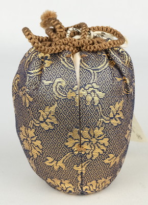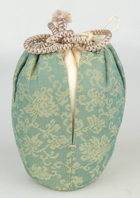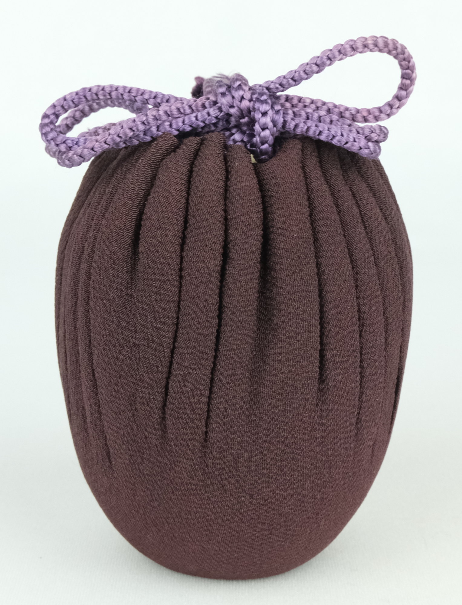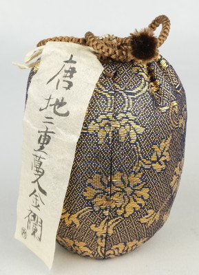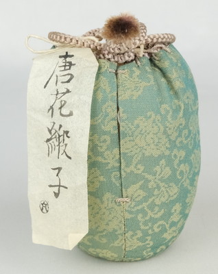 裏千家15代家元鵬雲斎お箱書で銘「閑松」とつけられた瀬戸茶入です。王道の瀬戸肩衝茶入で2つの仕服のほか、御物袋に挽家も付いた豪勢な次第となっています。裂地は唐地二重蔓金襴と唐花緞子です。