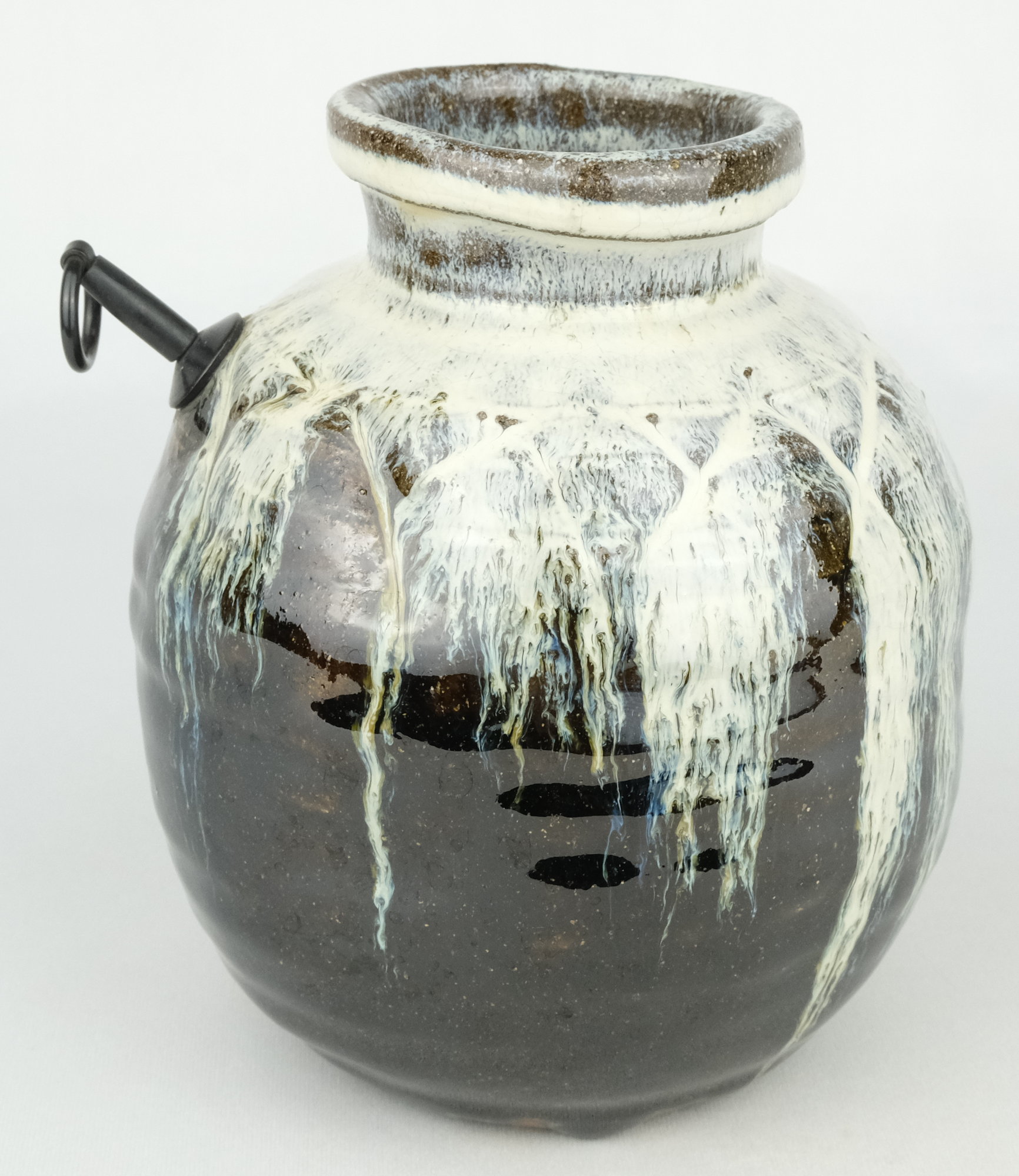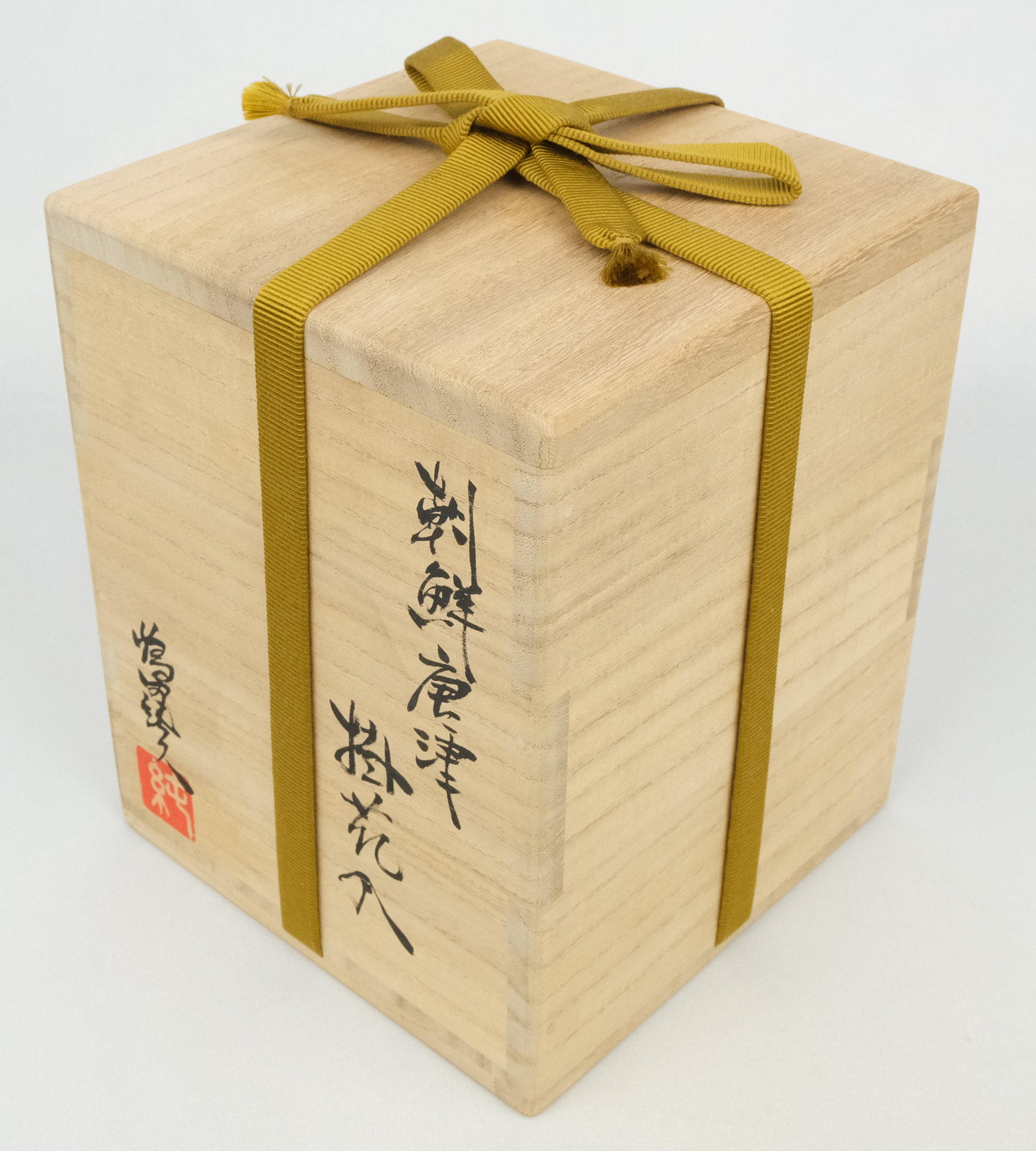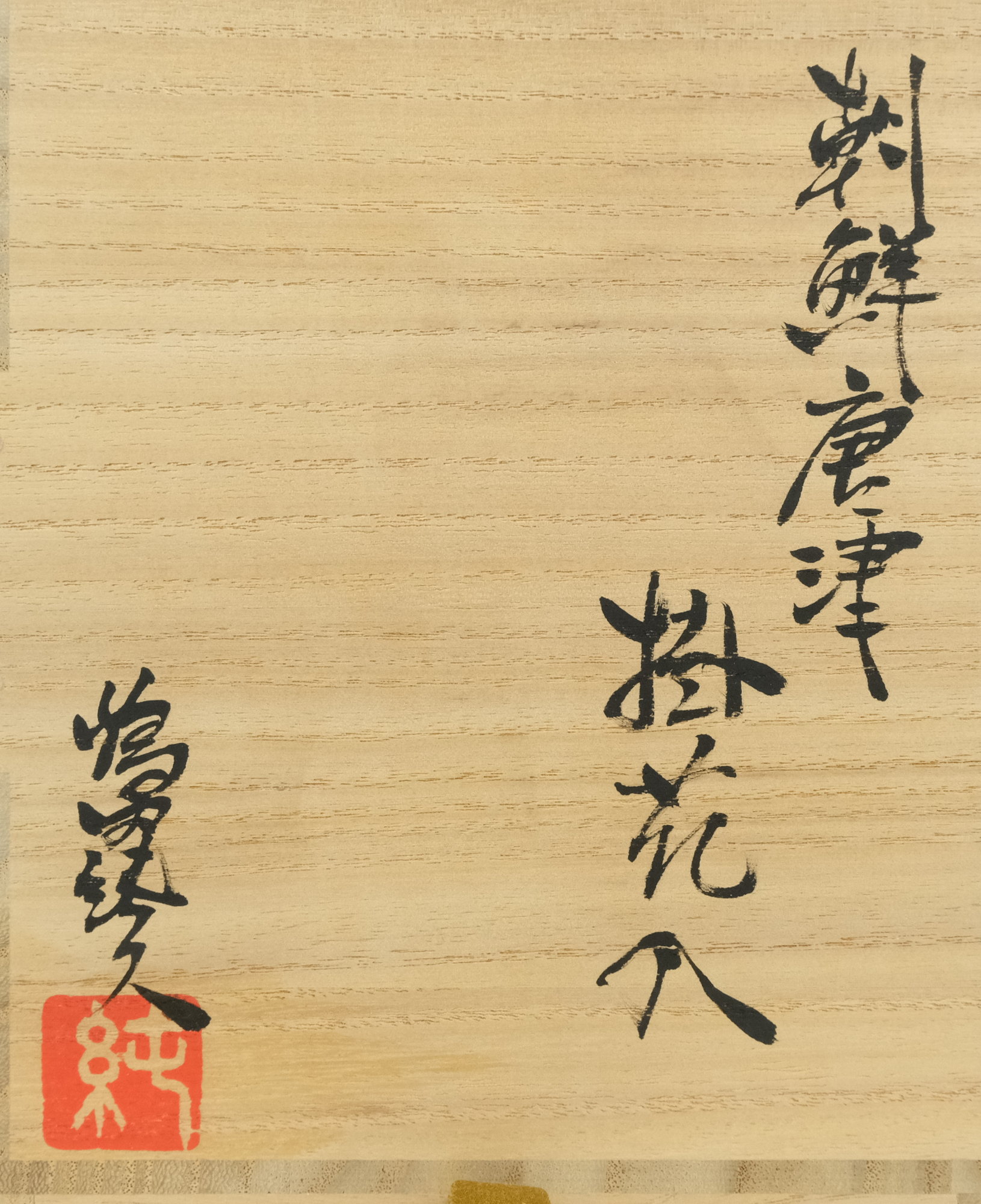 唐津焼の作家、鶴田純久作で朝鮮唐津掛花入です。朝鮮唐津らしい釉の流れがダイナミックな迫力ある花入です。掛花入ですがある程度寸法があるため置きでもお使いいただけます。