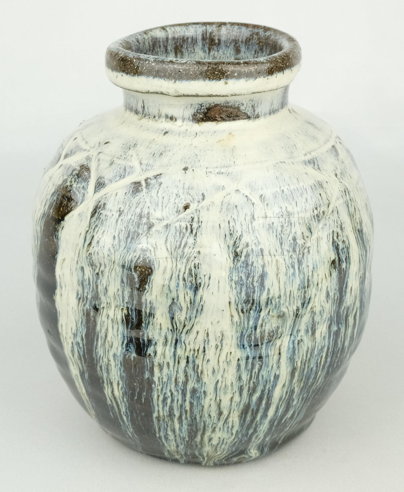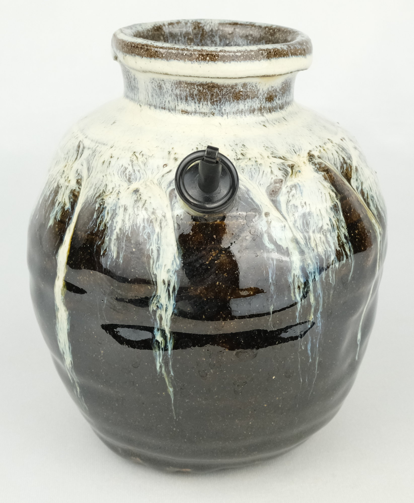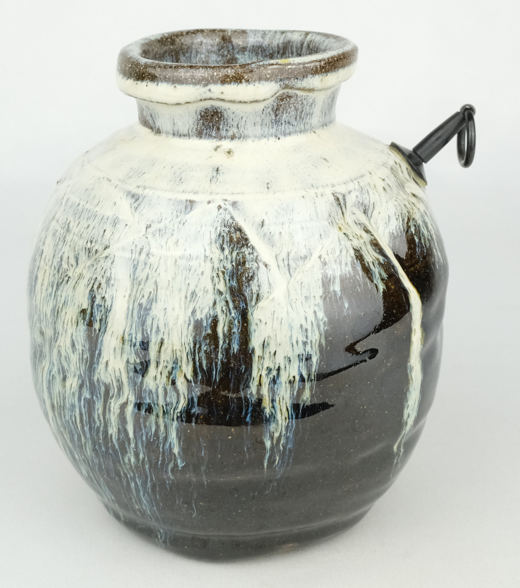 唐津焼の作家、鶴田純久作で朝鮮唐津掛花入です。朝鮮唐津らしい釉の流れがダイナミックな迫力ある花入です。掛花入ですがある程度寸法があるため置きでもお使いいただけます。