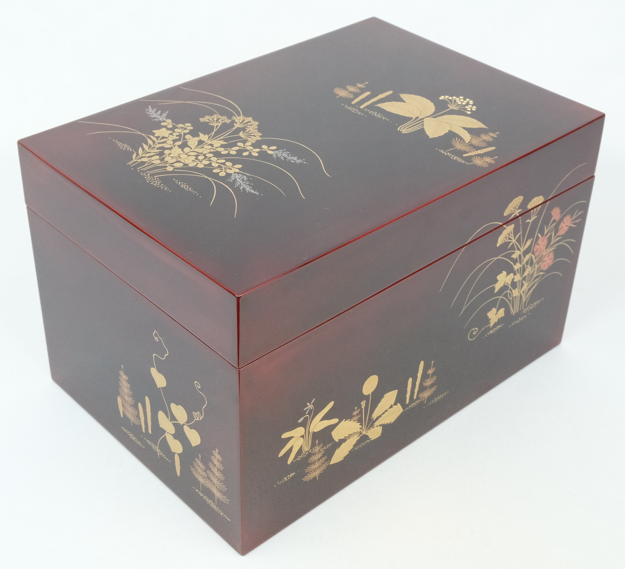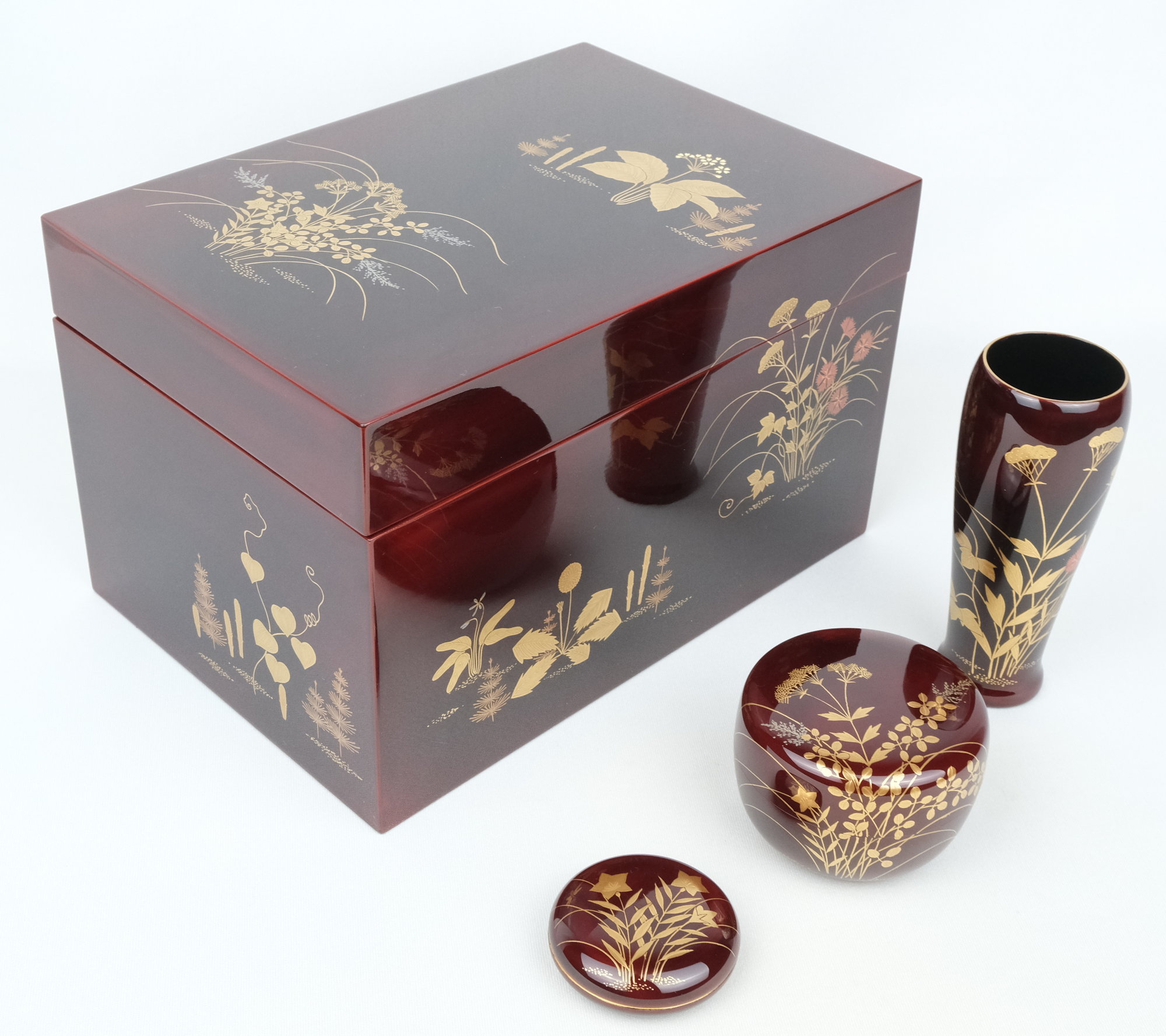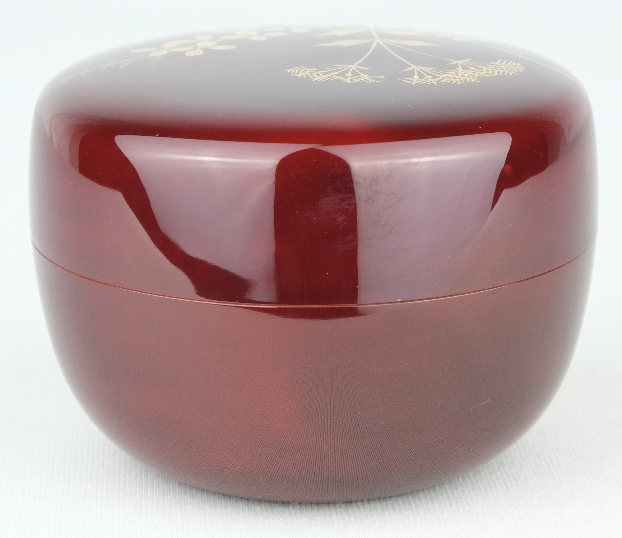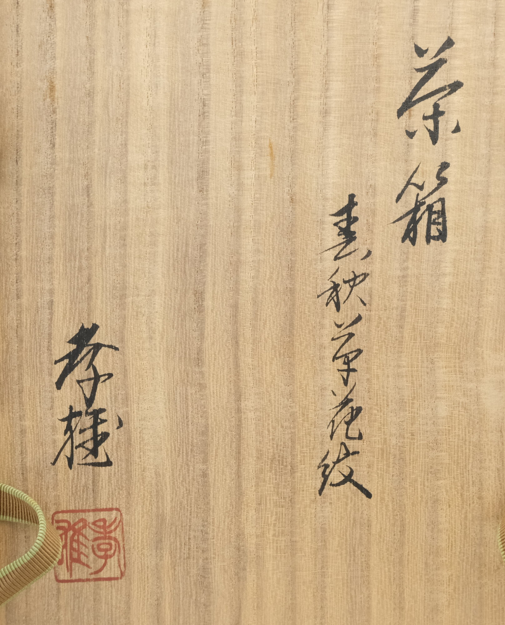| 寸法 | 茶箱:幅14.7cm × 奥行21.5cm × 高さ13.4cm 棗:直径6.7cm 高さ4.7cm 香合:直径4.8cm 高さ1.6cm 筅筒:直径4.5cm 高さ11cm |