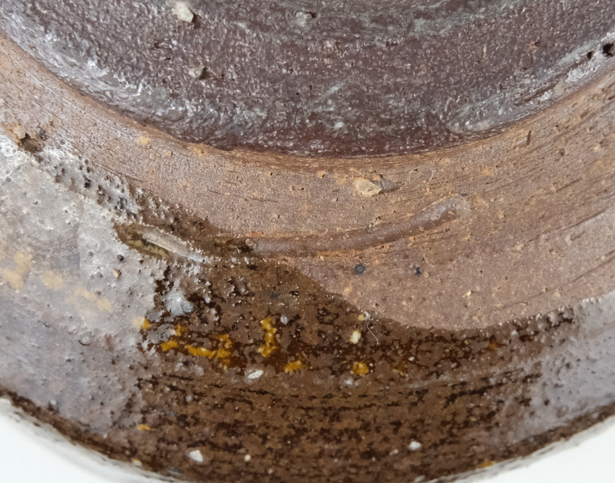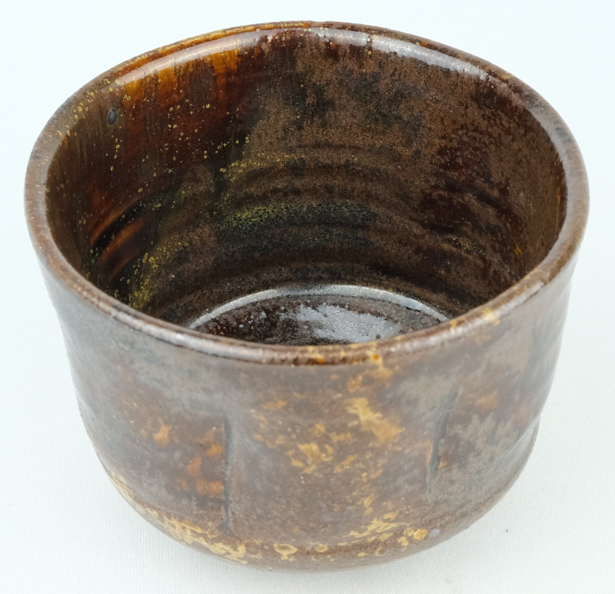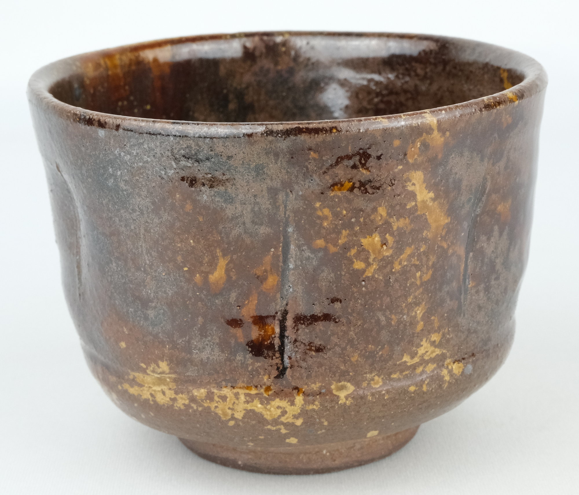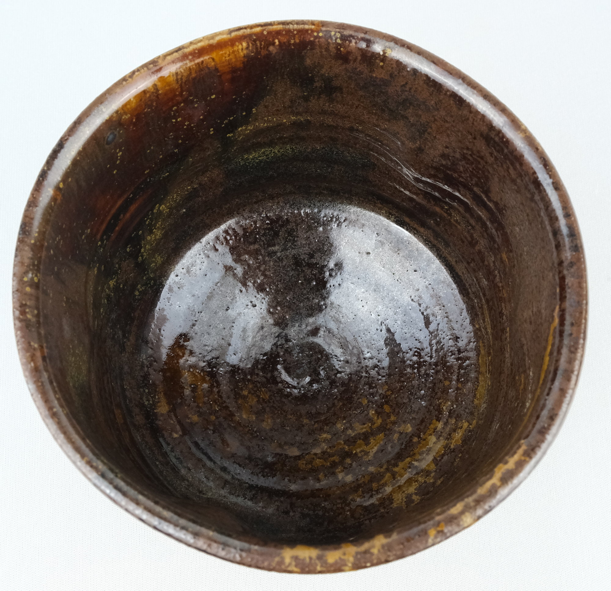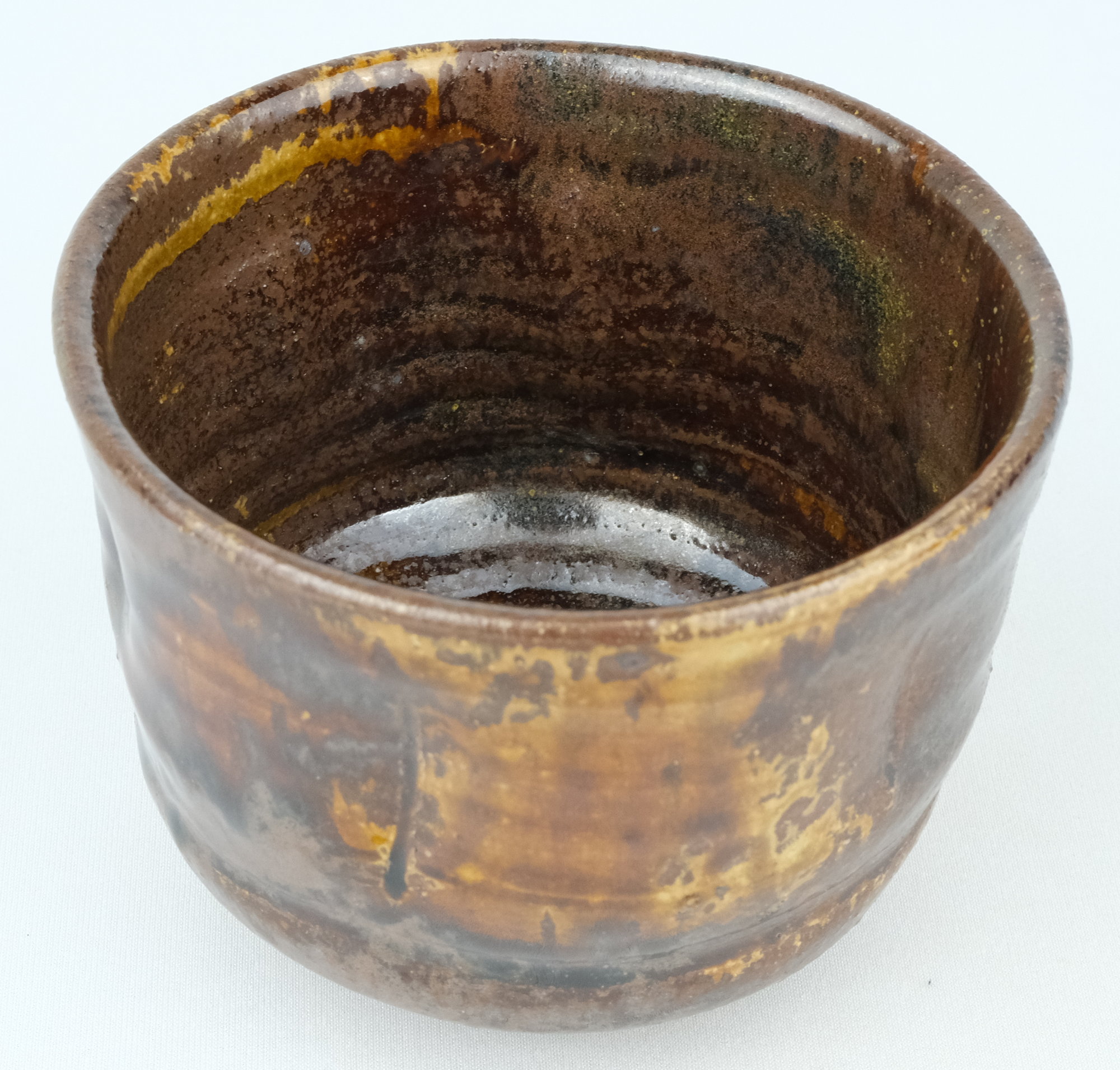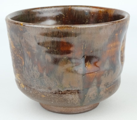 丹波焼の人気女流作家、石田陶春作で丹波飴釉茶碗です。変化の付いた形状のお茶碗に飴釉の豊かな景色が面白い丹波らしい味のある良いお茶碗です。