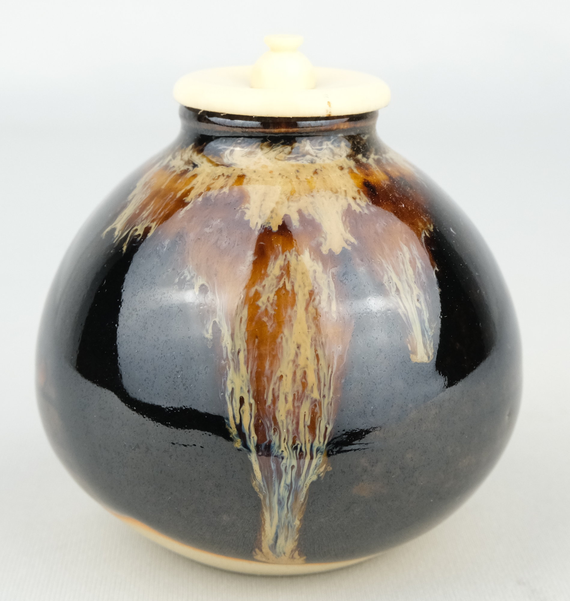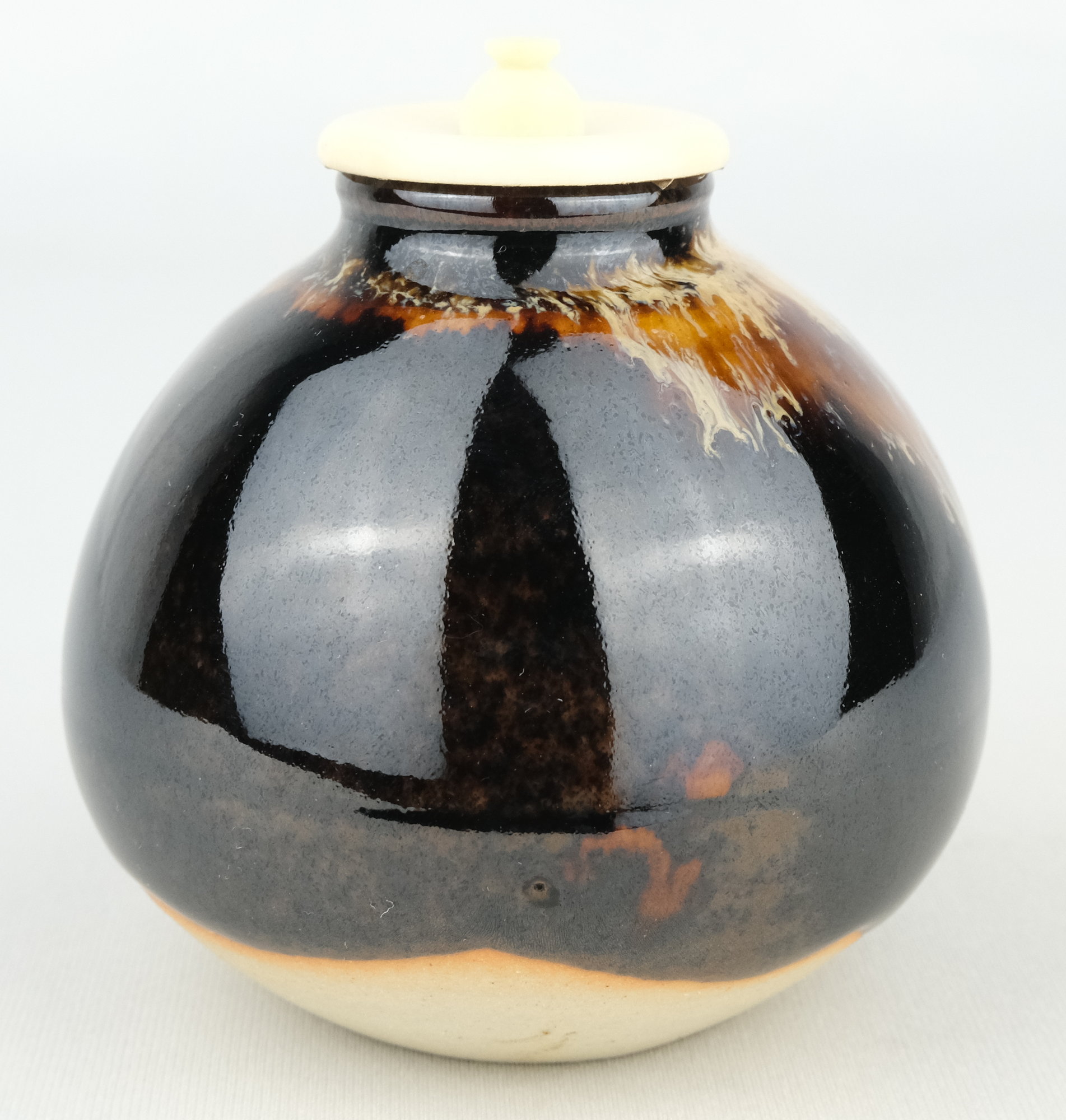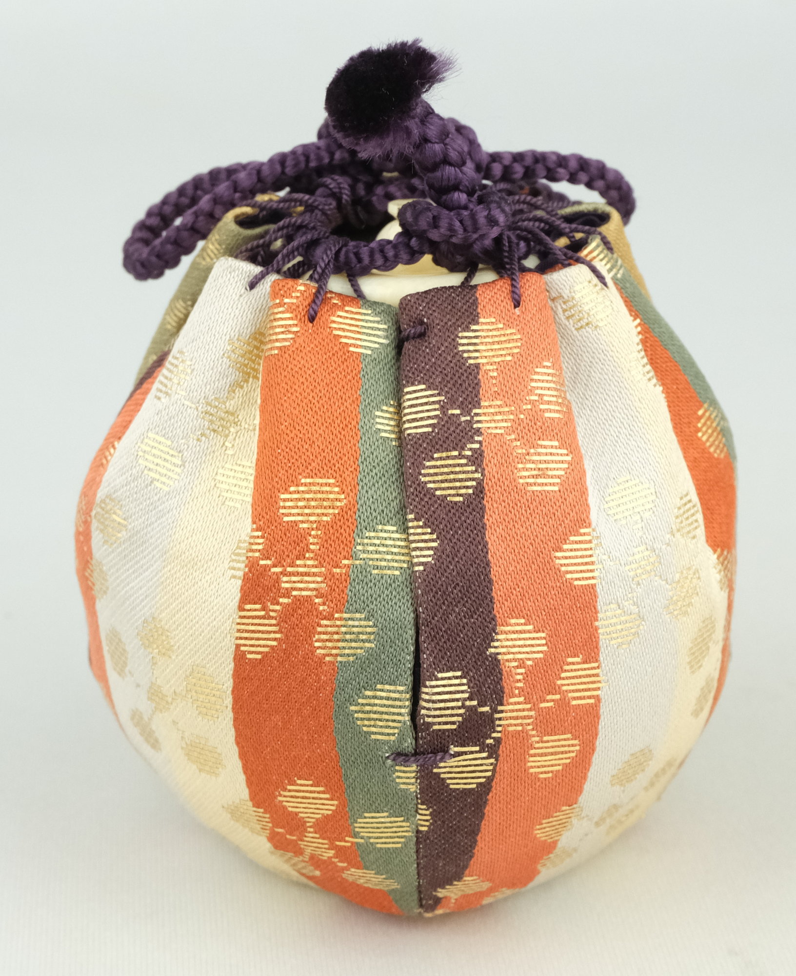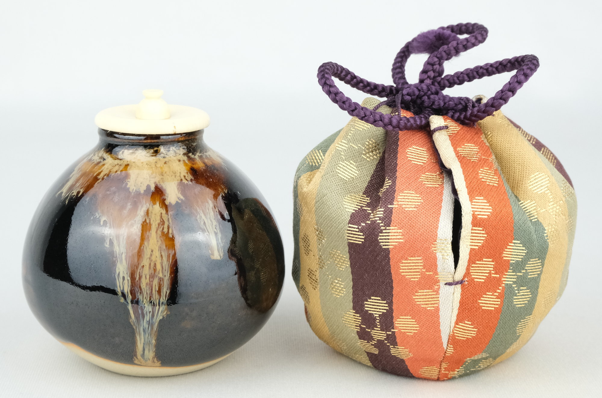京都の作家、桶谷定一作で茄子茶入です。唐物写のお稽古から使いやすい手のお茶入れです。仕服の裂地は利休梅です。