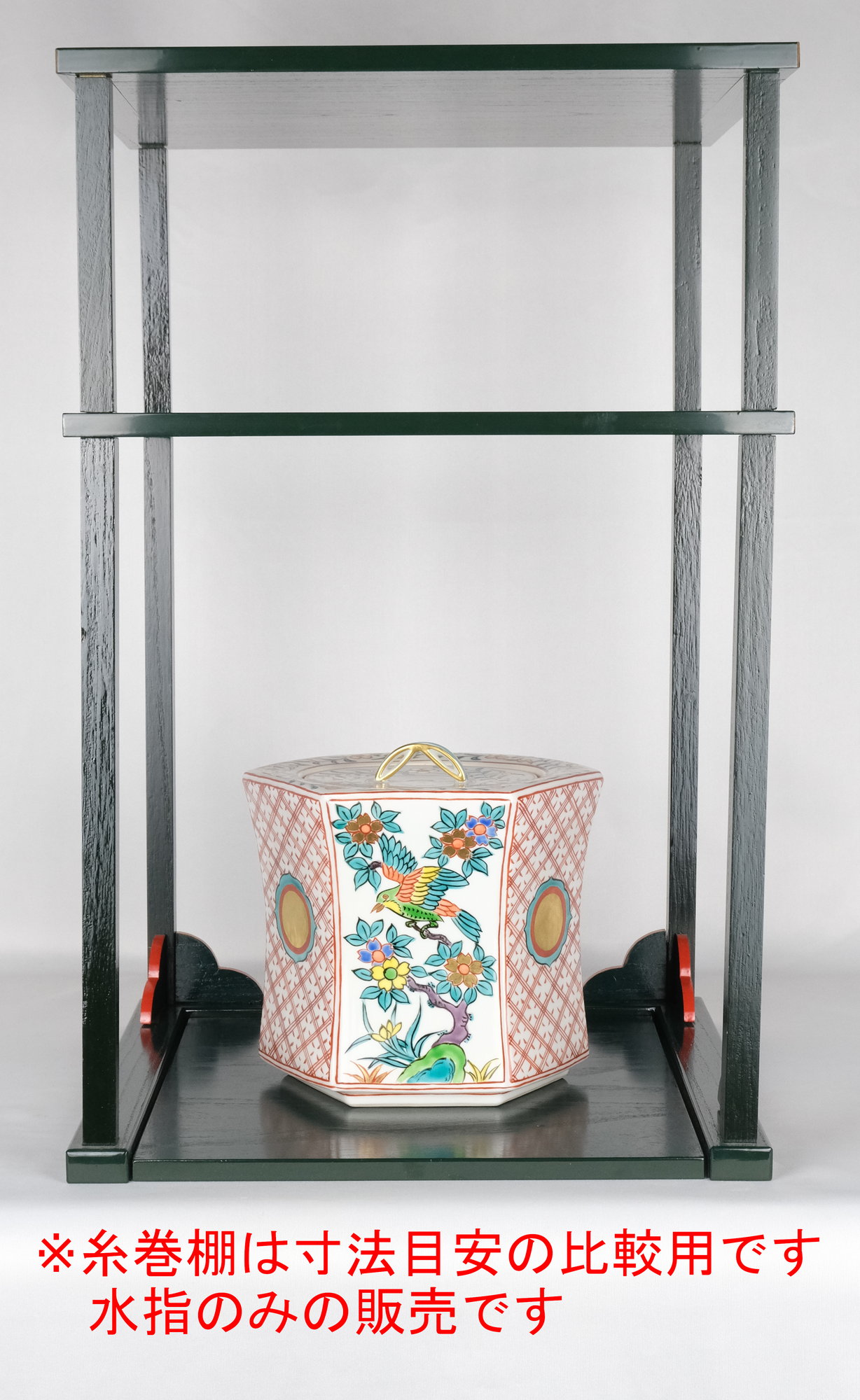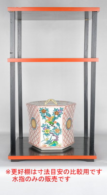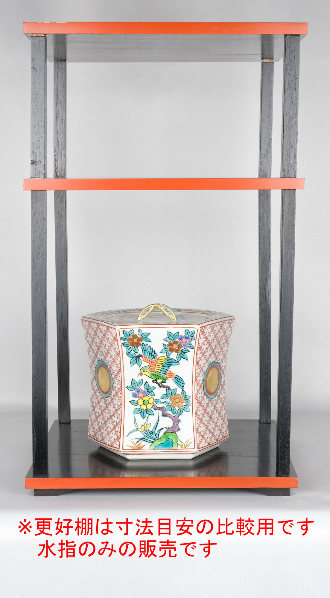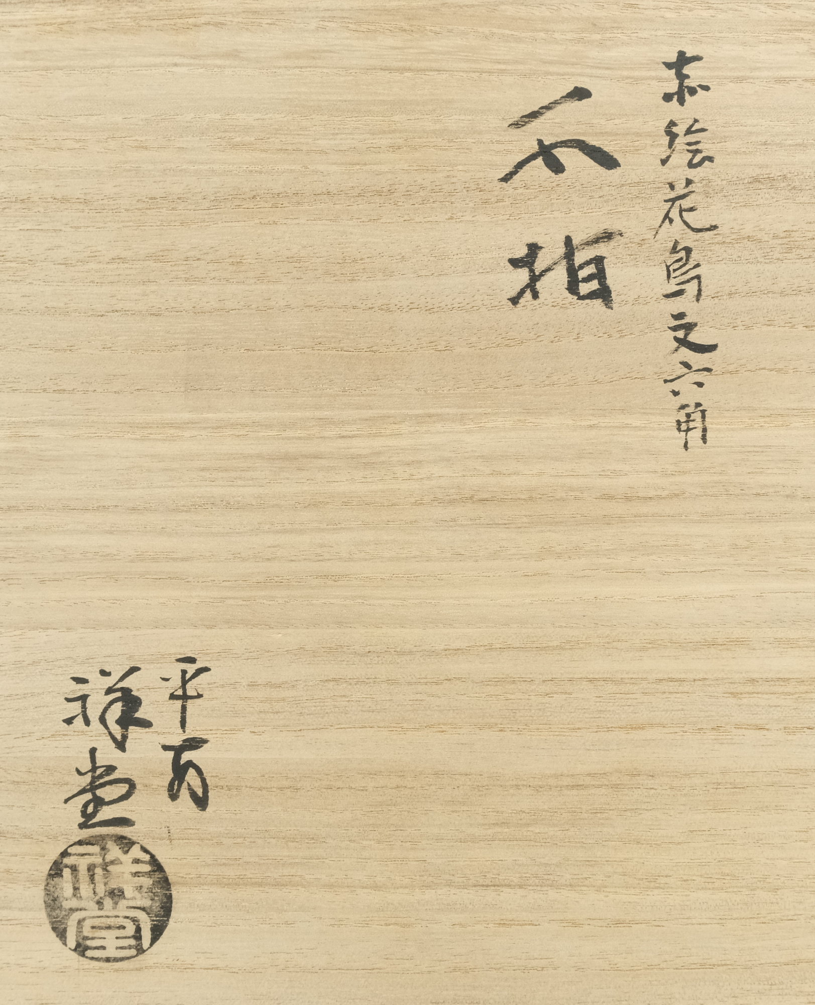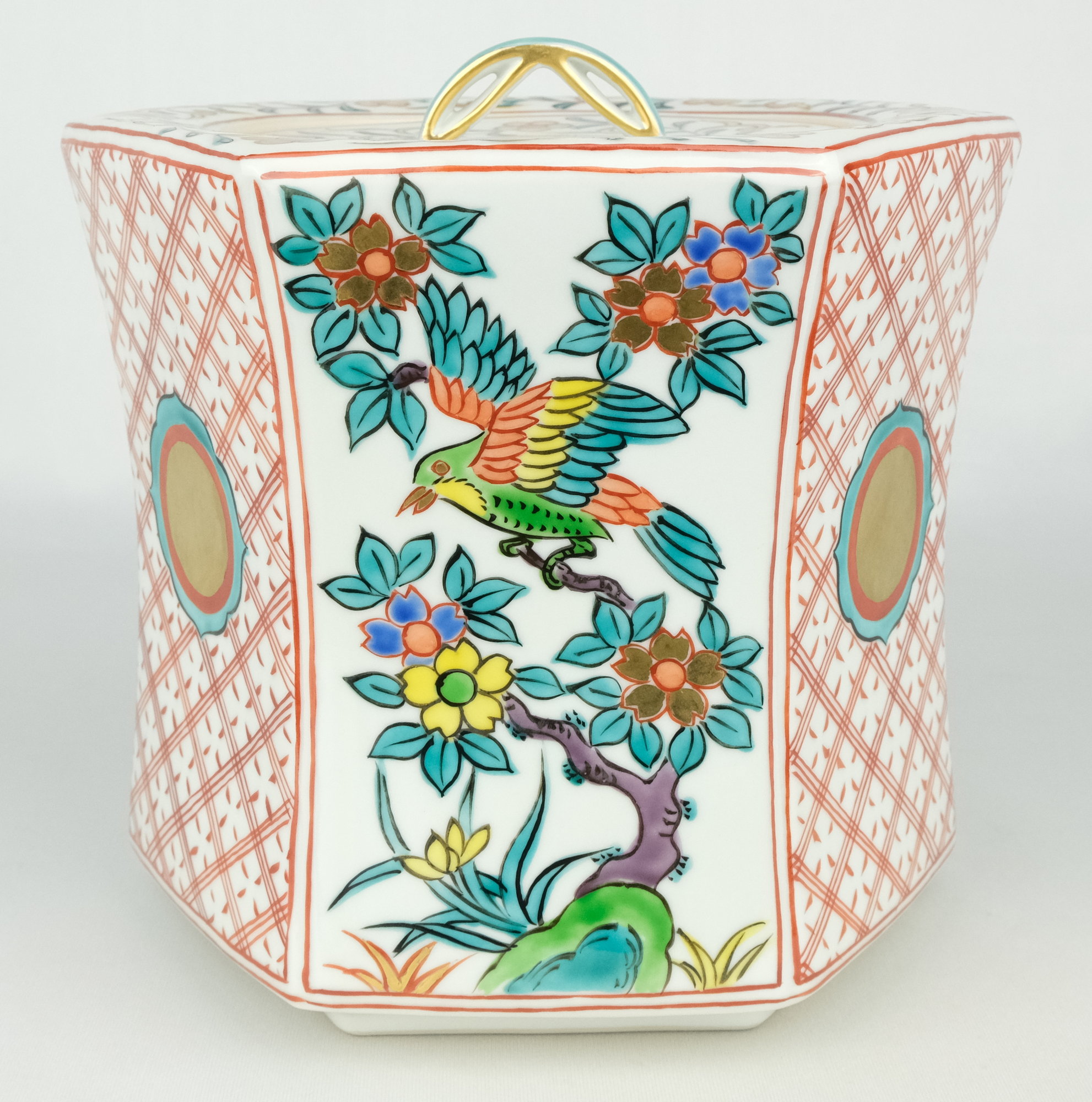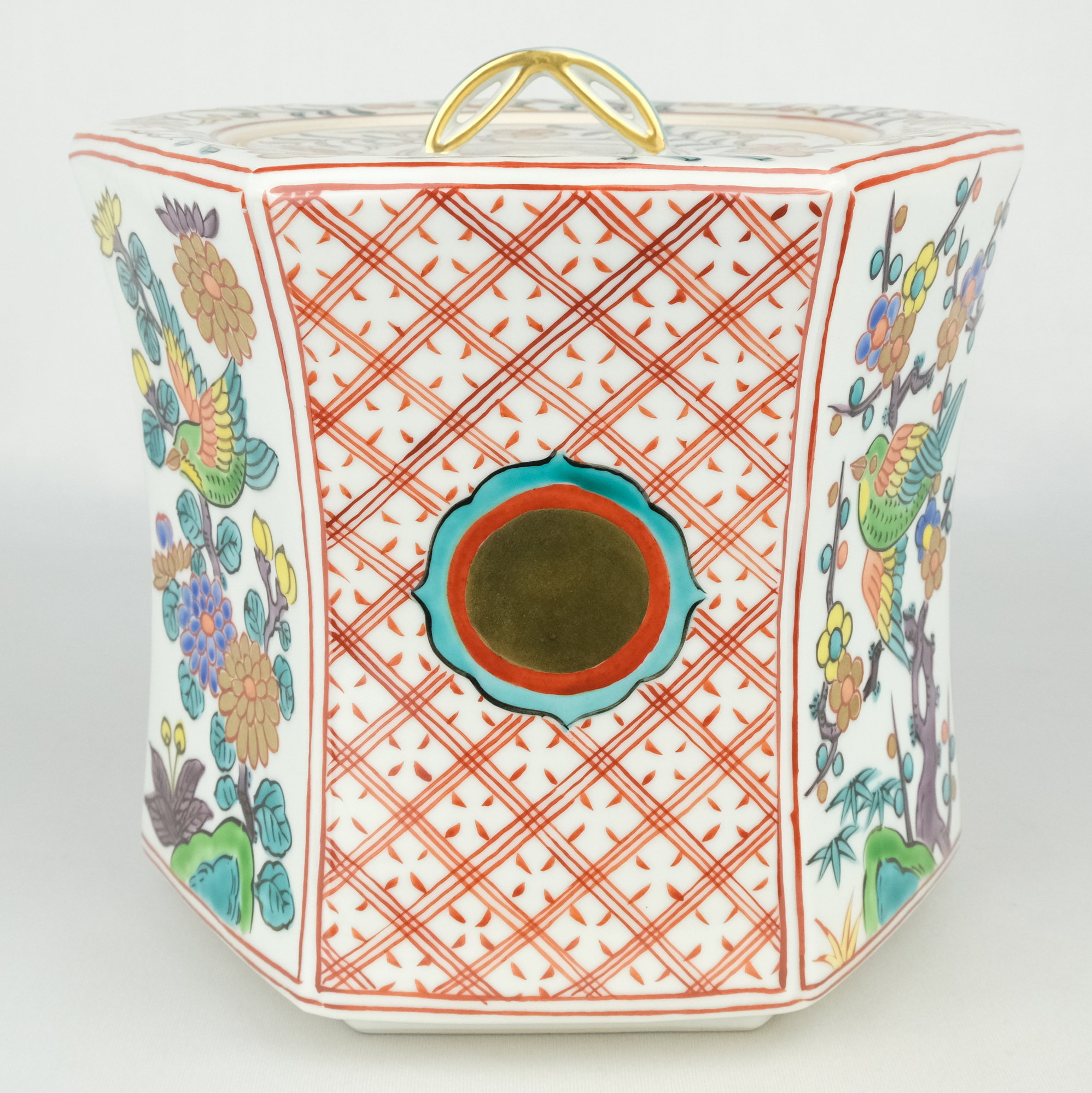京焼の作家、手塚祥堂作で赤絵花鳥文六角水指です。季節それぞれの花と鳥の紋様で、季節を問わずにお使いいただける使い勝手の良い水指です。