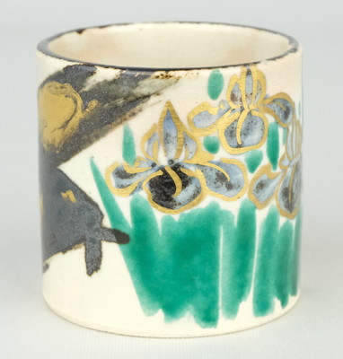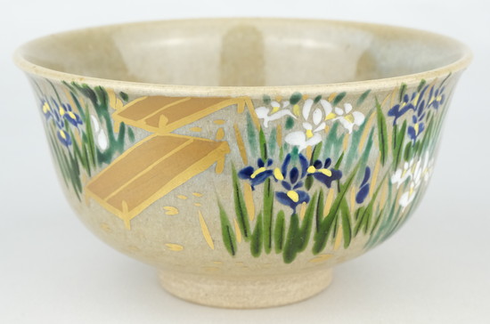 【出物】 膳所焼色絵八ツ橋茶碗 陽炎園(岩崎新定)