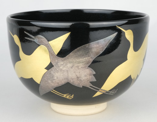 【出物】 黒釉金襴鶴茶碗 7代高橋道八
